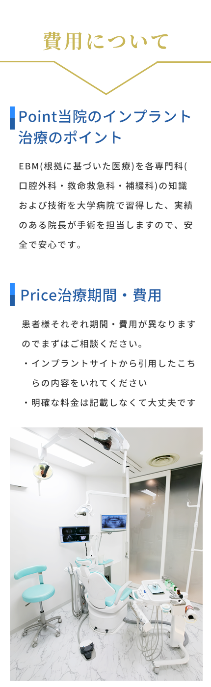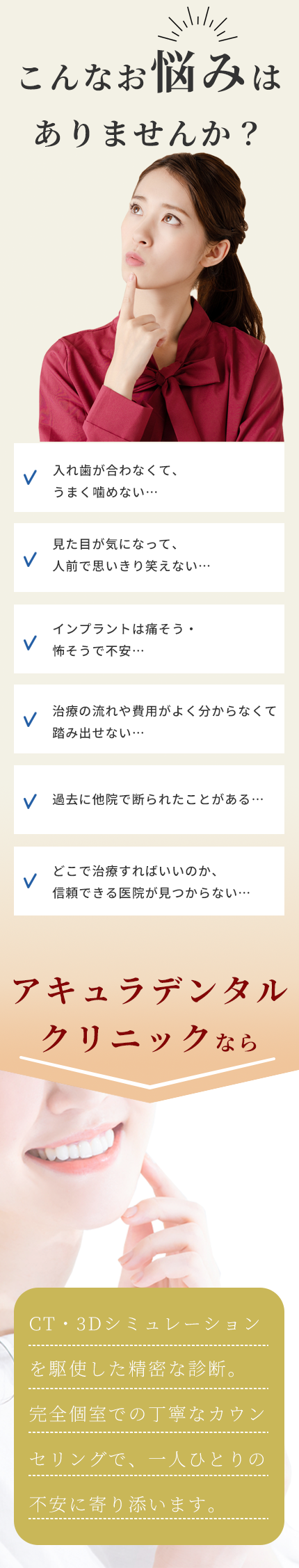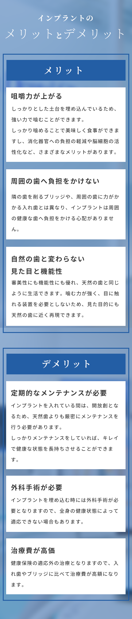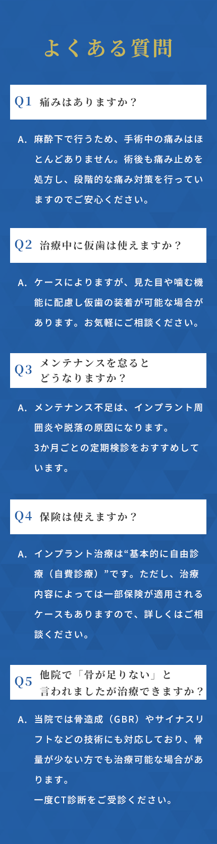 定期メンテナンスを行う事で、インプラント歯周炎、インプラントの脱落などの治療後のトラブルを防ぐ事に繋がります。 定期メンテナンスを行わない事が、結果、インプラントのトラブルに繋がっている ケースも少なくありません。