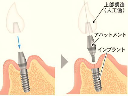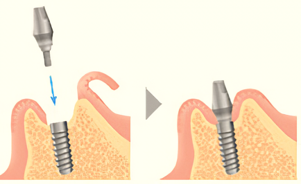 インプラントと骨がしっかり結合したら、インプラントを土台に人工歯を取り付けるために歯肉を開く手術します。その後、歯肉が回復するまで1~6週間待ちます。患者さんによっては手術が1回で終わる場合もあります。